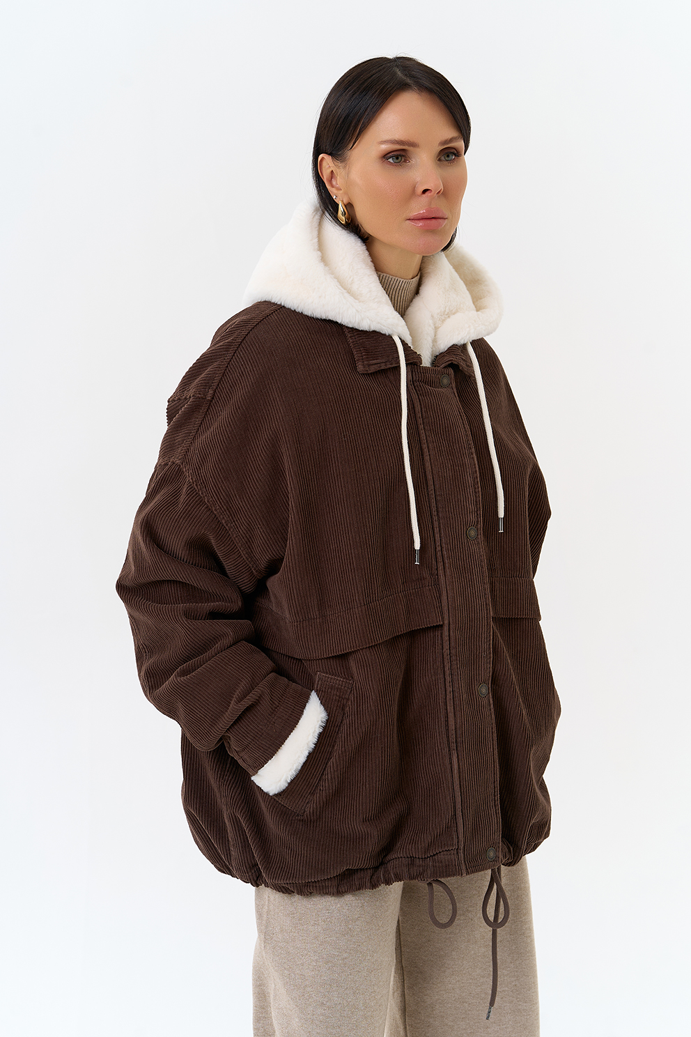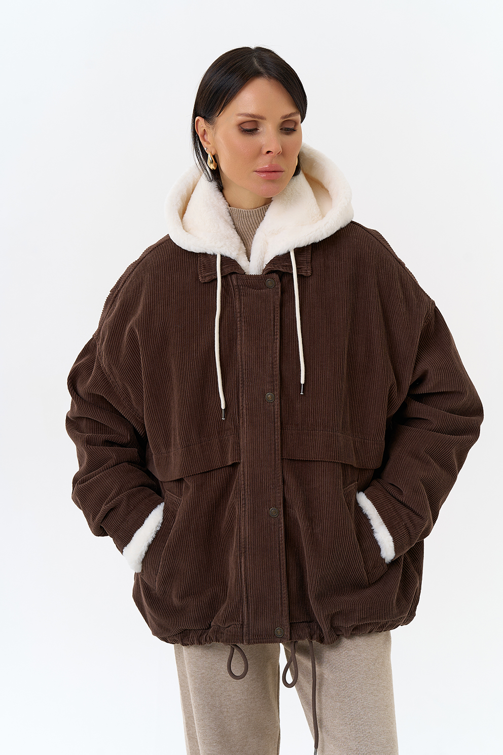 Крой воротника - съемный капюшон, отделка эко мех
